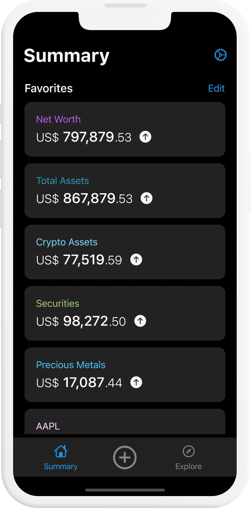 Automatic market value updates for stocks, ETFs, cryptocurrencies, precious metals, and other equities from U.S. and global markets.